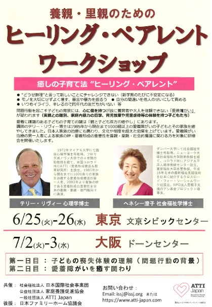 問題行動を起こす子どもの背景には、心に傷を持つが故に養育者や大人を信頼できない「愛着障がい」が疑われます(実親との離別、家庭内暴力の目撃、育児放棄や児童虐待等の体験を持つ子どもたち)。 愛着に課題のある子どもの子育ての鍵は「親と子ども双方の癒やし」にあります。講師のテリー・リヴィー博士は1985年から現在まで1000組以上の愛着障がいの子どもとその家族を癒やしてきました。日本人家族の治療にも携わり、文化や制度を超えた効果を上げています。愛着障がい治療の第一人者による家族の絆・愛着形成の重要性を養親・里親・社会的養護に関わる方を対象に研修会を開催いたします。